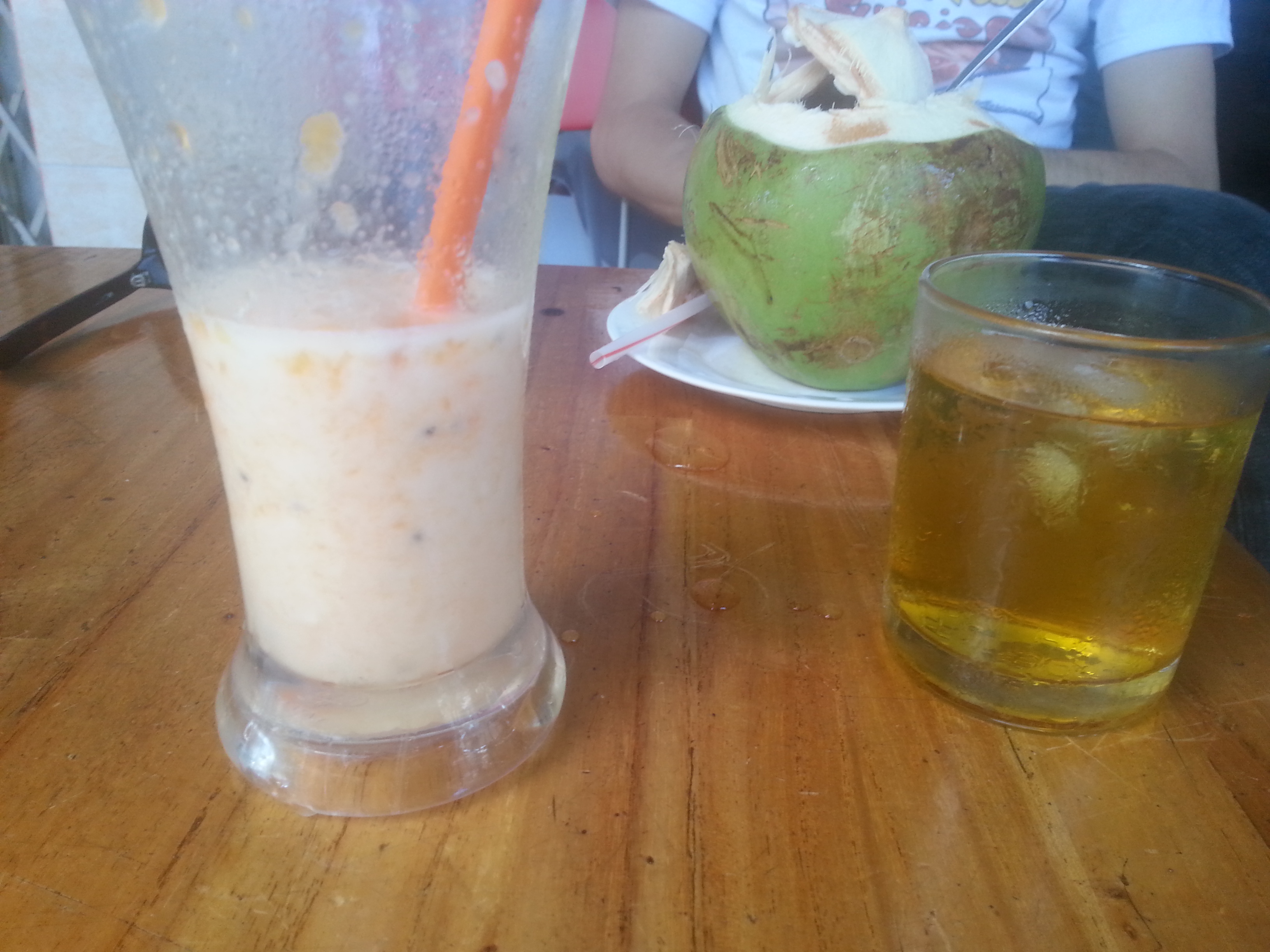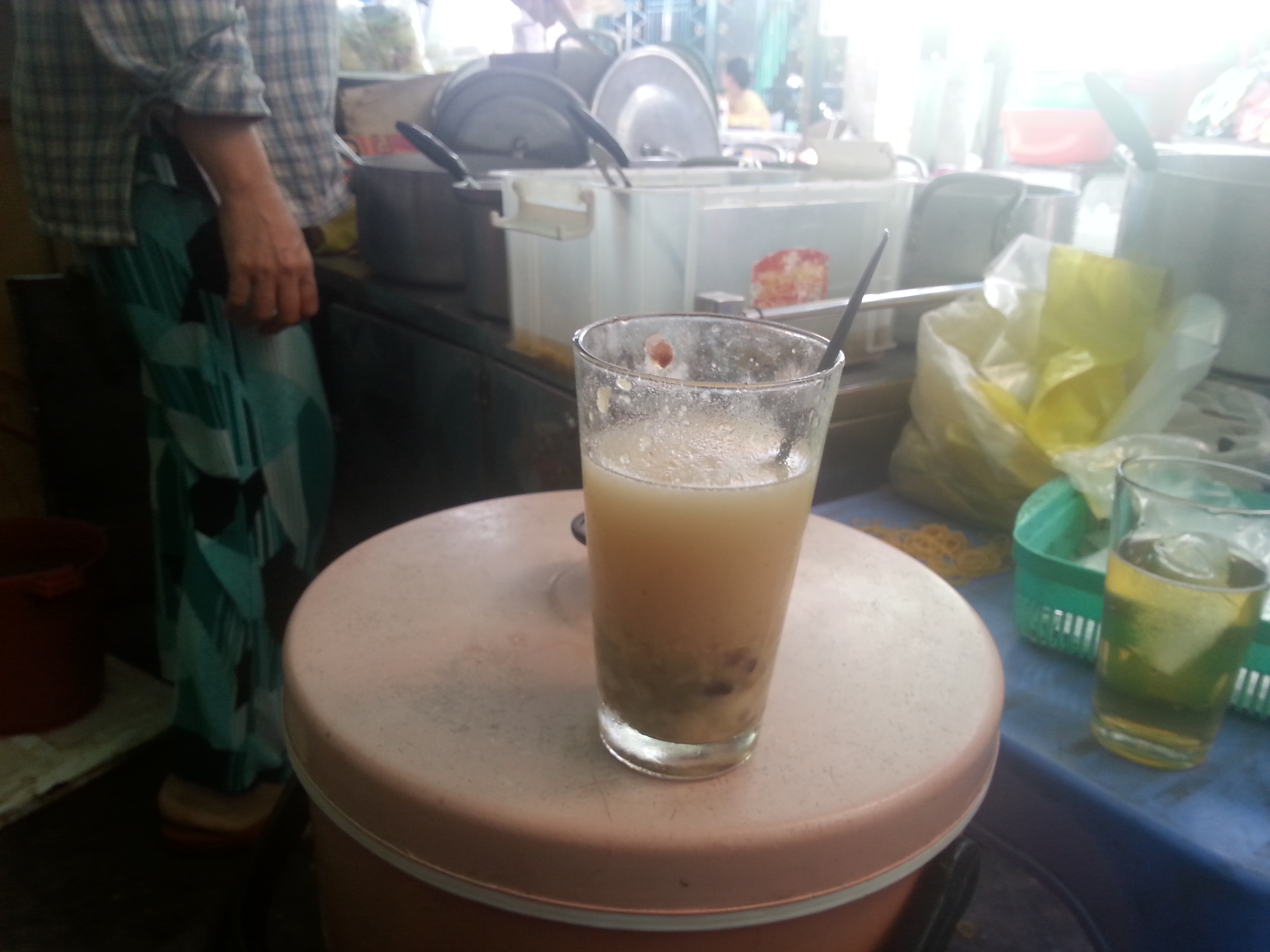 Slemmigt men mättande! Kokosmjölk, olika fruktbitar, socker och bönor. Det var gott men lite läskigt. Och som vanligt, en kopp kallt te!