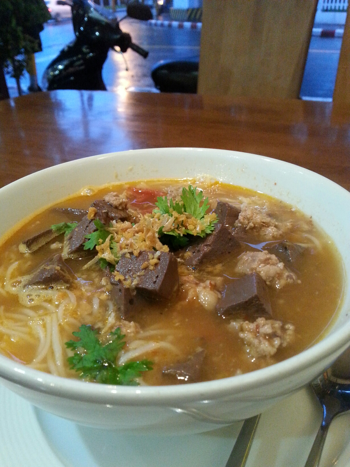 Återigen åt jag på mitt favoritställe. 92 Rachadamneon. Det blev gyoza med grönt iste och en currysoppa med kyckling och bitar av kycklingblod.