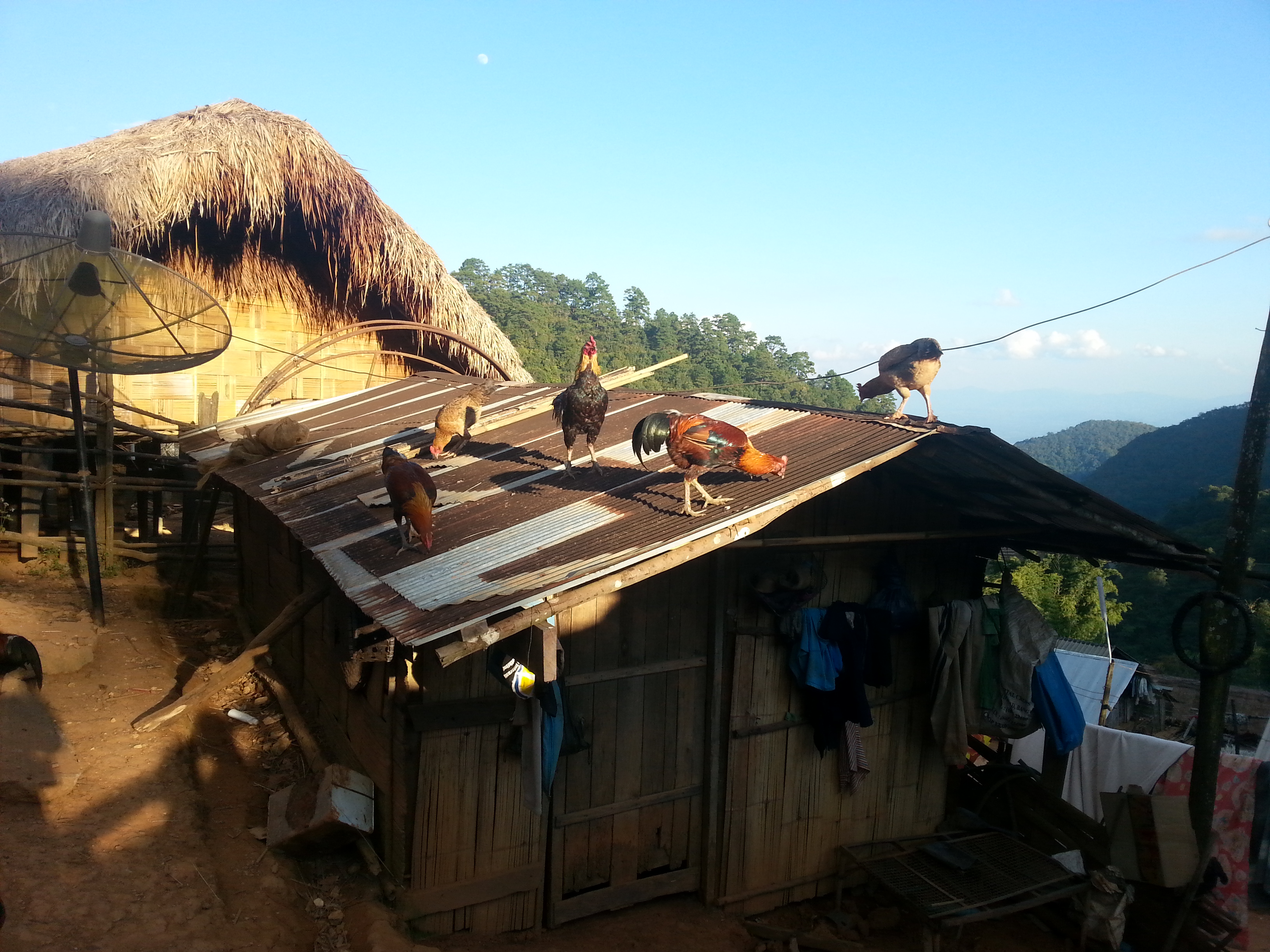 A couple of hundred meters aways was a Black Lahu village. They live very simple and they still live by a spirit religion. They have their homes on stilts, each home built in just one day and all the animals wandering around below them. Dogs, cats, pigs (all black of course) and chickens. They live and cook in the same room. Ten people usually sleep in the house we visited. Because they cook and sleep in the same room, without any hole in the roof it gets pretty filled with smoke. But that way they keep all the bugs out!